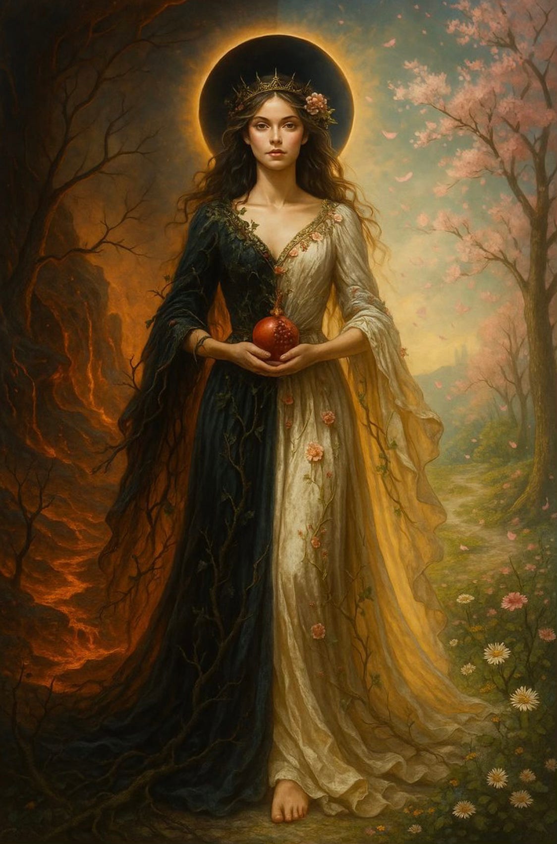 Did Persephone forget like I do that the easy feeling of a summer season must always come to an end? Did she fool herself like I do into thinking she had finally figured out the secret formula of how to stay above forever where the sun shines on her face? Year after year each time the earth opened to swallow her did she claw at the walls and let out a mournful cry? Did she try to negotiate for better terms or look for a way out of her fate? Did Persephone feel like a failure like I always do for not deciphering how to stay forever in the topside world of light and life and laughter? When an impending loss jump starts the torment of every defeat not fully felt when melancholy or anxiety abducts you when your productivity shatters when you are in that place beyond the reach of all your efforts to control or optimize your life do you too make yourself the problem? No one gets out of it, do they? Some too-heavy measure of grief of pain of sorrow that takes you down from time to time reminding you that forces larger than you are a part of this world that we must share space with Reminding you that a beating heart must periodically break and that the breath of life must occasionally sob out its own rhythm that this is the sacred contract inherent in being alive Did Persephone forget like I always do that she was never meant to be in control of this cycle? Meanwhile the earth pulls its energy back into itself for the winter the moon wanes and the nights swell into their dark fullness Meanwhile spring grows as a quiet promise in the belly of the earth not in some heroic defiance of winter but nourished by it brought into being by its surrender to that long passage through the dark How many times did Persephone descend before the panic abated and she stopped looking for a way out? For how many years did she enter the Great Below before she could keep her breath steady and stay with the ache in her chest vibrating with the memory of all she had lost? How long before she knew she could trust that the descent was no punishment and that spring would rise out of this death when the moment was right and bring her with it How many times did Persephone descend to the Underworld before she no longer blamed herself or lost herself in fear? How many seasons was it before she understood before she felt herself to be no longer its victim but finally walked down with her head held high knowing herself as its Queen